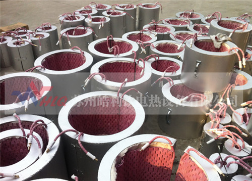 以履帶式加熱器作熱源,配以保溫材料及外殼,做成圈型對(duì)開式加熱器,便于裝卸,適用于中小型管道的局部加熱,最高工作溫度750℃。